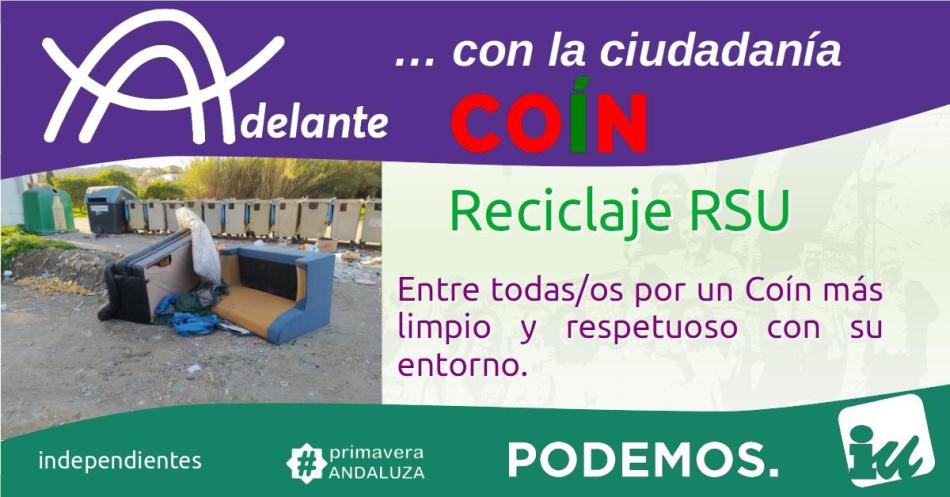 Desde Adelante Coín seguiremos muy atentos a todo cuanto tiene que ver con la gestión de los residuos de nuestro municipio y esperamos que nuestras aportaciones, junto con la predisposición del equipo de gobierno a abordar esta problemática y la colaboración de los vecinos y vecinas de Coín nos permitan, entre todos y todas, conseguir un Coín más limpio y respetuoso con su entorno y con el medio ambiente.