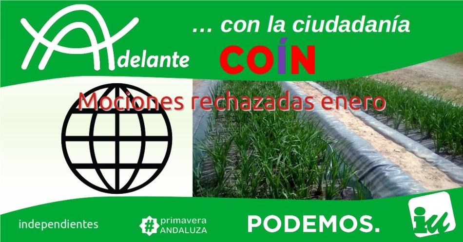 Para el Pleno Ordinario de Enero de 2021, desde Adelante Coín proponíamos cuatro mociones para su debate y aprobación: “Depuradora biológica en el Parque Lineal“, “Control biológico de la procesionaria del pino“, “Al pan de Coín, trigo de La Jara y harina dECOín” y “Apoyo en internet al pequeño comercio local“. Todas ellas compartían la preocupación por la reactivación económica orientada hacia los recursos locales y el pequeño comercio o la pequeña explotación agrícola. Conseguimos sacar adelante, con el voto unánime favorable de todos los Grupos Políticos, solo dos: “Control biológico de la procesionaria del pino” y “Al pan de Coín, trigo de La Jara y harina dECOín“. Las otras dos, “Depuradora biológica en el Parque Lineal“ y “Apoyo en internet al pequeño comercio local“, fueron rechazadas aunque obtuvieron los votos favorables de Andalucía por Sí, PSOE y de Adelante Coín.