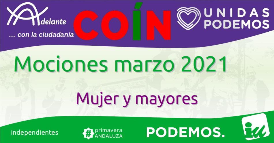 Para el pleno de marzo de 2021, desde Adelante Coín hemos preparado 3 mociones. Una, titulada «Retirada de todas las acciones políticas de la Junta de Andalucía que van en contra de la lucha por la igualdad de género«, para poner de manifiesto el retroceso en los derechos y la situación de las mujeres en Andalucía, debido a las medidas del Partido Popular y Ciudadanos, y otras dos, «Alternativas habitacionales para mayores no dependientes» y «Nuevo modelo de centros residenciales para mayores«, que inciden en mejorar la vida de nuestros/as mayores. Las explicamos brevemente a continuación.