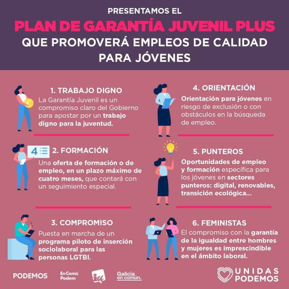Desde Unidas Podemos somos muy conscientes de que los jóvenes han sufrido especialmente la crisis provocada por la pandemia ya que muchos de ellos ya partían de situaciones laborales muy precarias y marcadas por la temporalidad y la inseguridad y la pandemia ha hecho que muchos pierdan sus empleos o se encuentren ahora en situaciones aún más precarias. A todos estos jóvenes que se encuentran en situaciones desesperadas queremos darles esperanzas y decirles que desde Unidas Podemos estamos trabajando incansablemente para impulsar, desde el gobierno de coalición, soluciones reales a sus problemas.