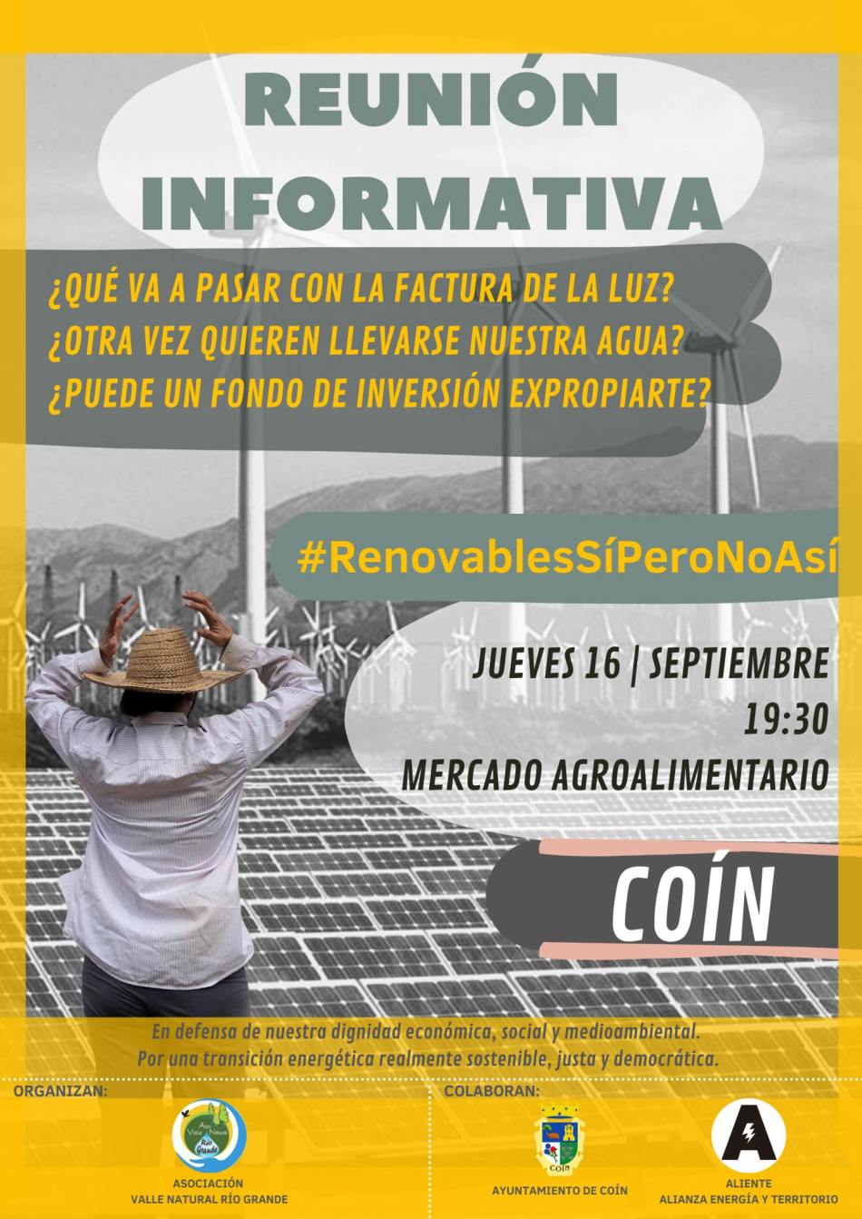 Aunque se ha conseguido mucho; como convencer a la mayoría de Ayuntamientos de paralizar por un año de la mayor parte de los proyectos, aún queda mucho por hacer. Para seguir informado y concienciando a nuestro Ayuntamiento, Grupos Políticos, Asociaciones, Colectivos y demás ciudadanía, la Asociación Valle Natural Río Grande organiza para mañana jueves 16 de septiembre a las 19:30 h, en el Mercado Agroalimentario del Guadalhorce, en La Trocha, en Coín, una interesante reunión acerca de los proyectos de macroplantas fotovoltaicas en el Guadalhorce, de la factura de la luz, de las posibles expropiaciones …