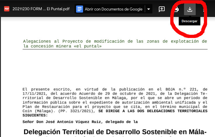 En el campo «Expone» escribe o copia y pega «En el Boletín Oficial de la Junta de Andalucía (BOJA) n.º 221, de 17 de noviembre de 2021, se publica el Acuerdo de 29 de octubre de 2021, de la Delegación Territorial de Desarrollo Sostenible en Málaga, por el que se abre un periodo de información pública sobre el expediente de autorización ambiental unificada y el Plan de Restauración para el Proyecto de modificación de las superficies de explotación de la concesión minera «el puntal», recurso de la Sección C núm. 6250, en el término municipal de Coín (Málaga), promovido por Productos Dolomíticos de Málaga, S.A. Estimando que afecta a una zona de importantes valores ambientales, sociales y económicos, como conocedxr de la zona y considerándome afectadx por el proyecto previsto, estando dentro del plazo en que se somete el expediente a información pública, presenta las ALEGACIONES contenidas en el documento adjunto, tanto a efectos de la evaluación de impacto ambiental, así como del resto de autorizaciones y pronunciamientos ambientales que deban integrarse en la Autorización Ambiental Unificada, como en relación con el procedimiento para la autorización del Plan de Restauración.»