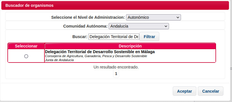 Para elegir el organismo destinatario pulsa en «buscador», a la derecha del campo y en el campo «Seleccione el Nivel de Administración» elige «Autonómico». En el campo «Comunidad Autónoma» elige «Andalucía» y en el campo «Buscar» escribe o copia y pega «Delegación Territorial de Desarrollo Sostenible en Málaga» y dale al botón «filtrar». Te debe salir un solo resultado; pincha sobre circulito a la izquierda para seleccionar.