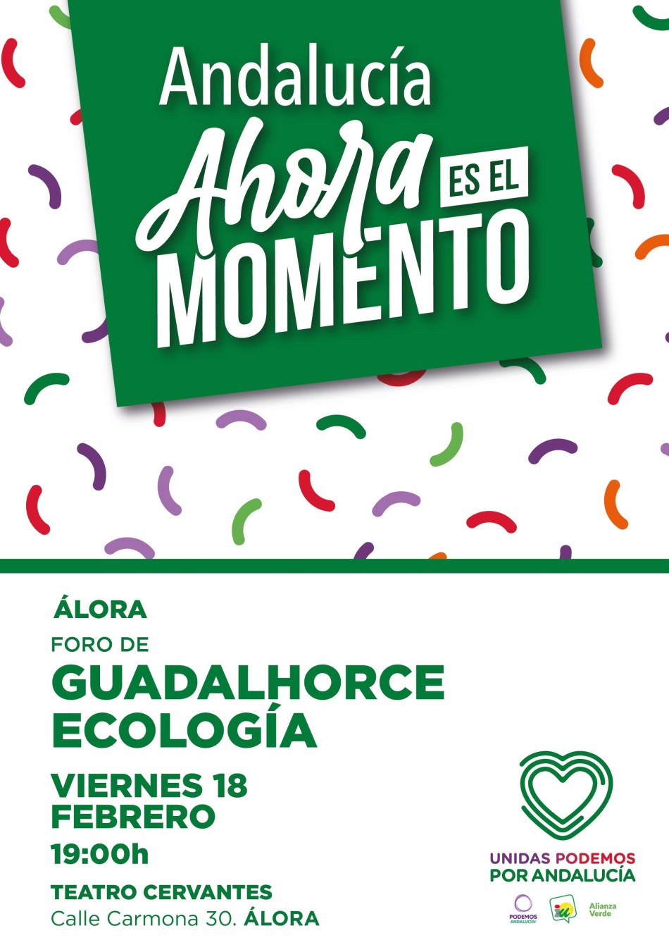 Unidas Podemos por Andalucía les invita al «Foro programático Ecología en el Guadalhorce». Se trata de un encuentro, con colectivos sensibles a los aspectos ambientales, en el que conversar y proponer aspectos claves para el futuro medioambiental de la comarca del Guadalhorce, la provincia de Málaga y nuestra Comunidad Autónoma.
