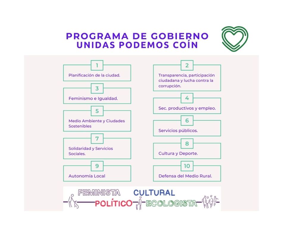 Saludos. Unidas Podemos Coín está en pleno proceso de elaboración del Programa de Gobierno para las próximas Elecciones Municipales. Nos gustaría contar con tu colaboración. Para ello hemos previsto dedicar una semana (aunque se podrán seguir haciendo aportaciones después) a cada gran área de nuestro (y vuestro) Programa de Gobierno, utilizando de base para ello el Programa con que nos presentamos a las elecciones municipales de 2019. La operativa será muy sencilla: