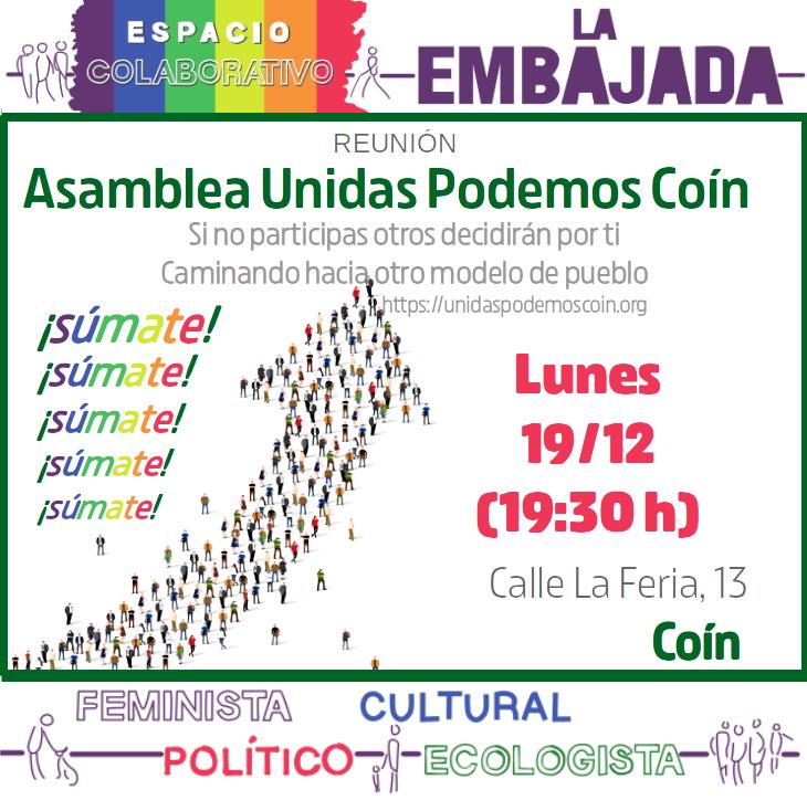 Mediante la presente comunicación se le invita a la reunión de la Asamblea de Unidas Podemos Coín, que se celebrará el lunes 19/12/2022 entre las 19:30 h y las 21:00 h. La reunión se celebrará de forma presencial en “La Embajada” vuestro espacio de C/ La Feria 13, y online en Telegram (pincha en el siguiente vínculo el 19/12/2022 a partir de las 19:00 h)