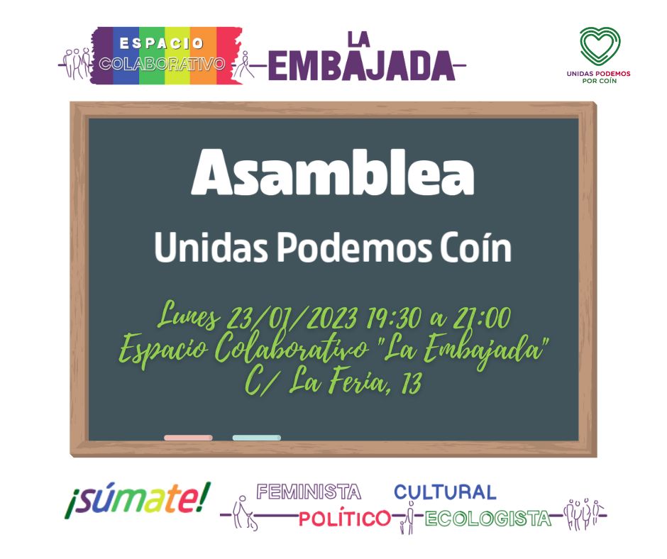 Mediante la presente comunicación se le invita a la reunión de la Asamblea de Unidas Podemos Coín, que se celebrará el lunes 23/01/2023 entre las 19:30 h y las 21:00 h. La reunión se celebrará de forma presencial en “La Embajada” vuestro espacio de C/ La Feria 13, y online en Telegram (pincha en el siguiente vínculo el 23/01/2023 a partir de las 19:00 h)