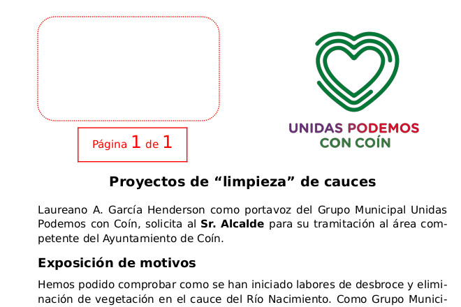 Laureano A. García Henderson como portavoz del Grupo Municipal Unidas Podemos con Coín, solicita al Sr. Alcalde para su tramitación al área competente del Ayuntamiento de Coín.