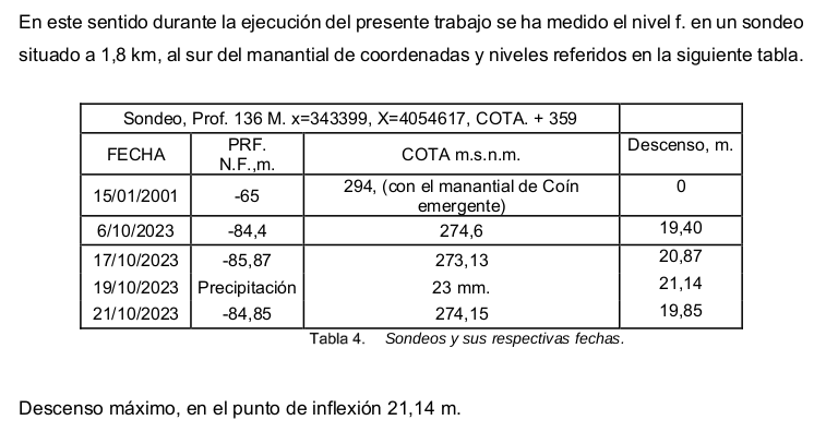 Tabla 4 del «estudio independiente» sin paginar del «INFORME HIDROGEOLÓGICO SOBRE EL ACUÍFERO DONDE SE SITÚAN LOS LLANOS DE MATAGALLAR EN EL MUNICIPIO DE COÍN (MÁLAGA) Nº EXP. 86 / 23» encargado por Nature Call