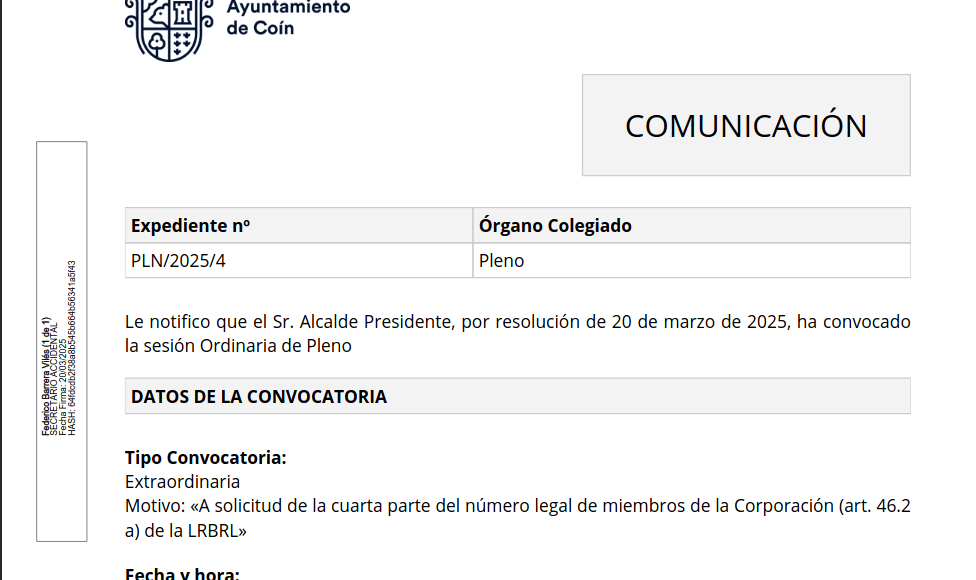 Convocatoria para el 27/03/2025 12:00 h. en el Salón de Plenos del Ayuntamiento de Coín.