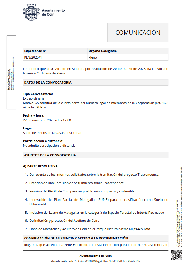 El Alcalde de Coín convoca un Pleno Extraordinario sobre Matagallar, forzado por la petición de 9 concejalas y concejales de PSOE, AxSí y Unidas Podemos con Coín, amparadas por el artículo 78.2 del Real Decreto 2568/1986, de 28 de noviembre, por el que se aprueba el Reglamento de Organización, Funcionamiento y Régimen Jurídico de las Entidades Locales y el artículo 46.2 de la Ley 7/1985 de 2 de abril de Bases de Régimen Local, que regulan las sesiones extraordinarias de los plenos