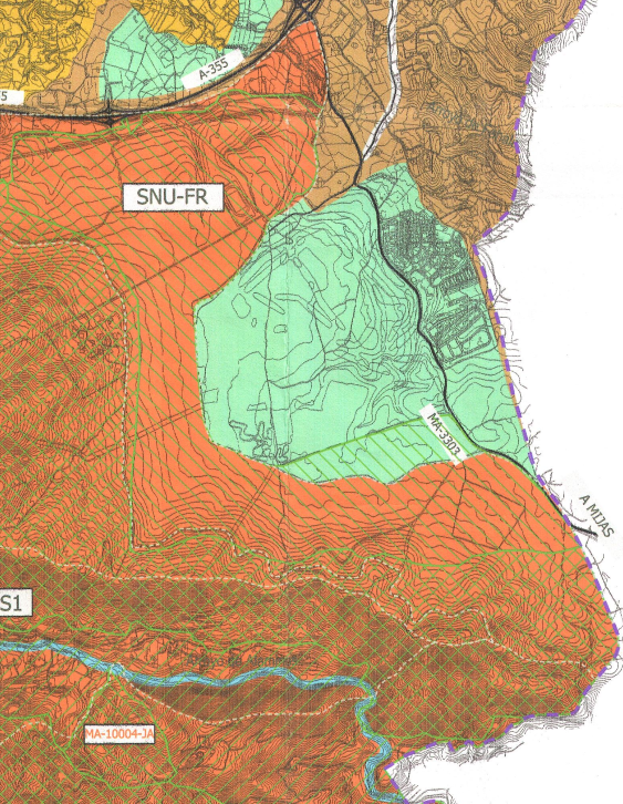 Elementos naturales como ríos, arroyos, vertientes u otros, suelen servir de límites, de lindes de facto, entre las zonas urbanizables y las rurales o las naturales. En otras ocasiones, son elementos introducidos por el hombre, como un muro, un camino o una carretera. En el caso de los terrenos que nos ocupan, además de ser una especie de bocado al territorio natural, del monte, son los únicos terrenos urbanizables al oeste de la carretera MA-3303 o al sur de la carretera A-355, rompiendo esa especie de límite simbólico de lo no urbanizable, de lo natural, en la zona sureste de nuestro término municipal.