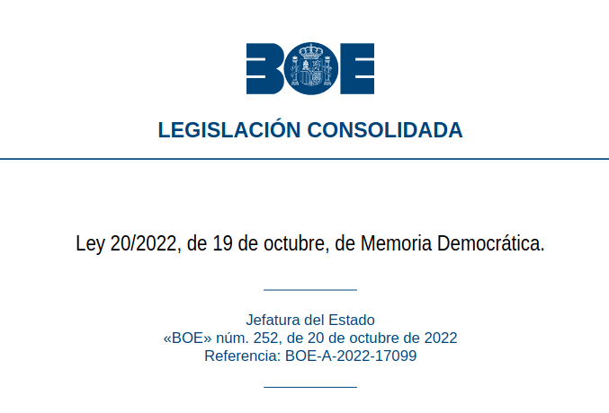 La Ley 20/2022, de 19 de octubre, de Memoria Democrática, que entró en vigor el 21 de octubre de dicho año, se fundamenta en los principios de verdad, justicia, reparación y garantías de no repetición, así como en los valores democráticos de concordia, convivencia, pluralismo político, defensa de los derechos humanos, cultura de paz e igualdad de hombres y mujeres.