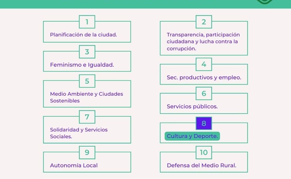 - Crear el Consejo Municipal de Cultura como órgano de participación ciudadana en la que estarán presentes todas las asociaciones culturales y artistas del pueblo. De manera transparente y participativa se decidirá el presupuesto a dedicar a Cultura en el Ayuntamiento.